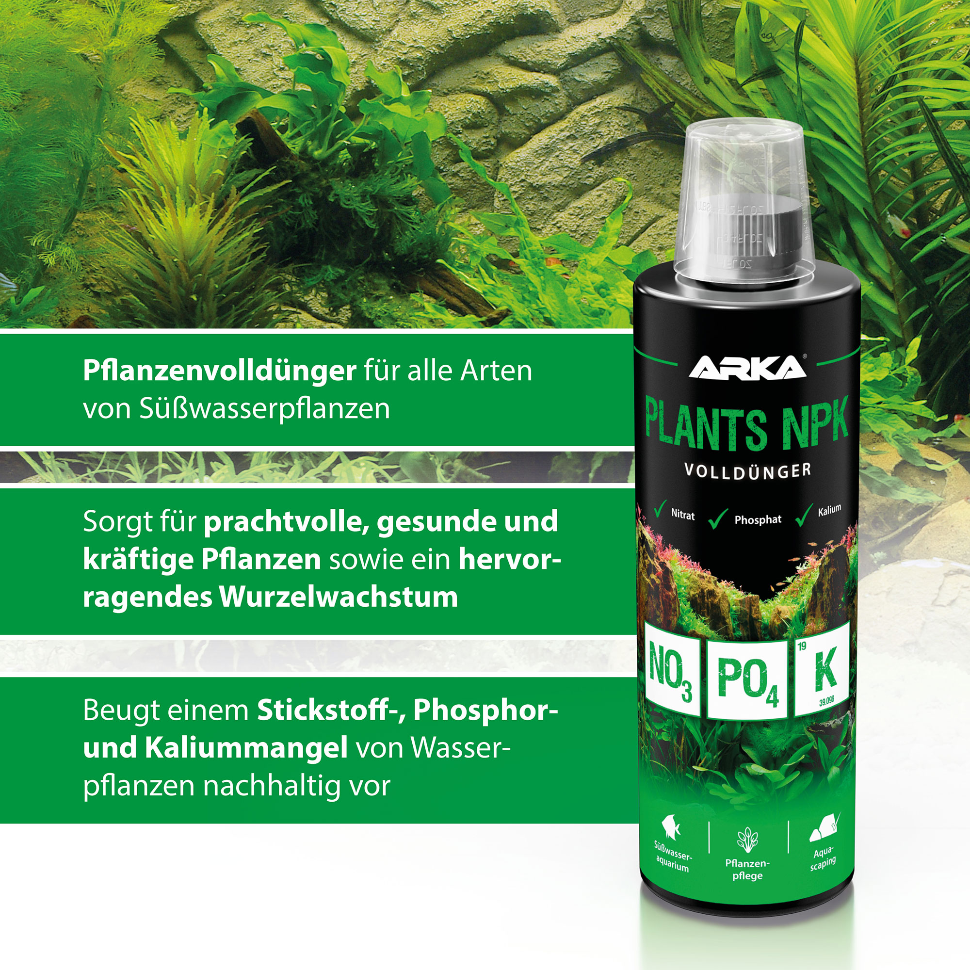 Plants NPK ist der speziell entwickelte Pflanzenvolldünger, der Deinen Wasserpflanzen alles bietet, was sie für ein kräftiges und gesundes Wachstum benötigen. Dank seiner einzigartigen Zusammensetzung sorgt Plants NPK für prachtvolle Pflanzen und optimiert gleichzeitig das Wurzelwachstum.