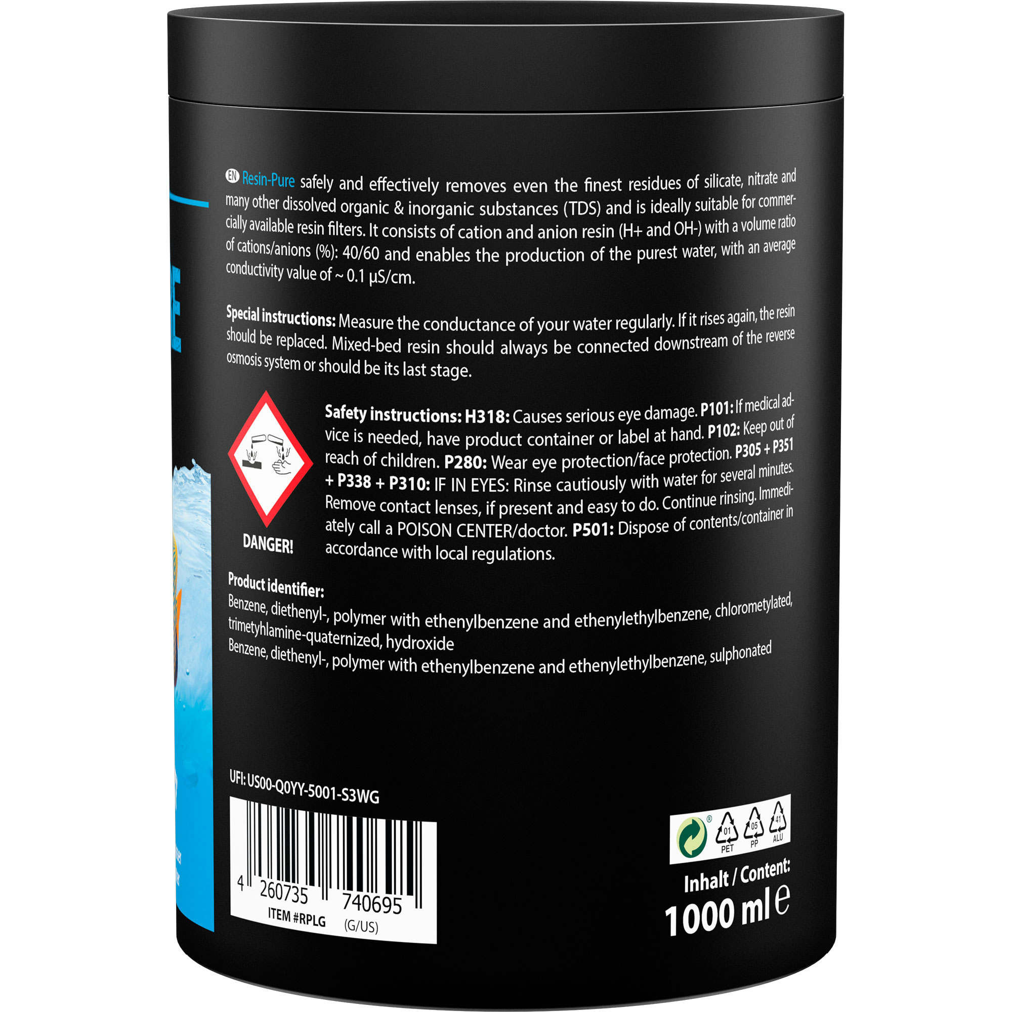 RESIN-PURE ist kompatibel mit handelsüblichen Resinfiltern und eignet sich hervorragend als letzte Stufe nach der Umkehrosmose. So kannst du sicherstellen, dass dein Wasser stets von höchster Qualität ist und frei von schädlichen Rückständen bleibt.