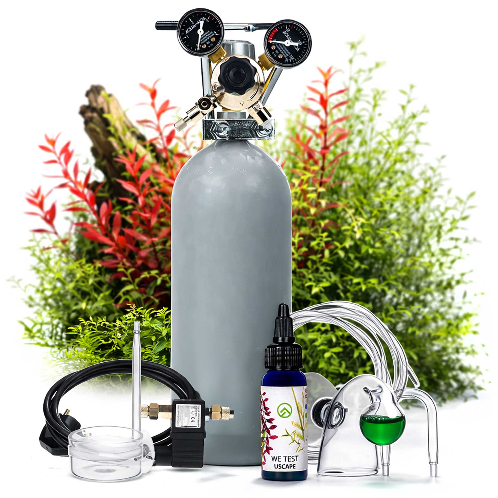 ▷ CO2 Komplettsystem mit einstellbaren Druckminderer deiner Wahl, 2kg Mehrweg CO2-Flasche, Nachtabschaltung mit Rückschlagventil, Diffusor deiner Wahl, Druckschlauch, Silikonluftschlauch, CO2-Dauertest, CO2-Testflüssigkeit und U-Pipe.