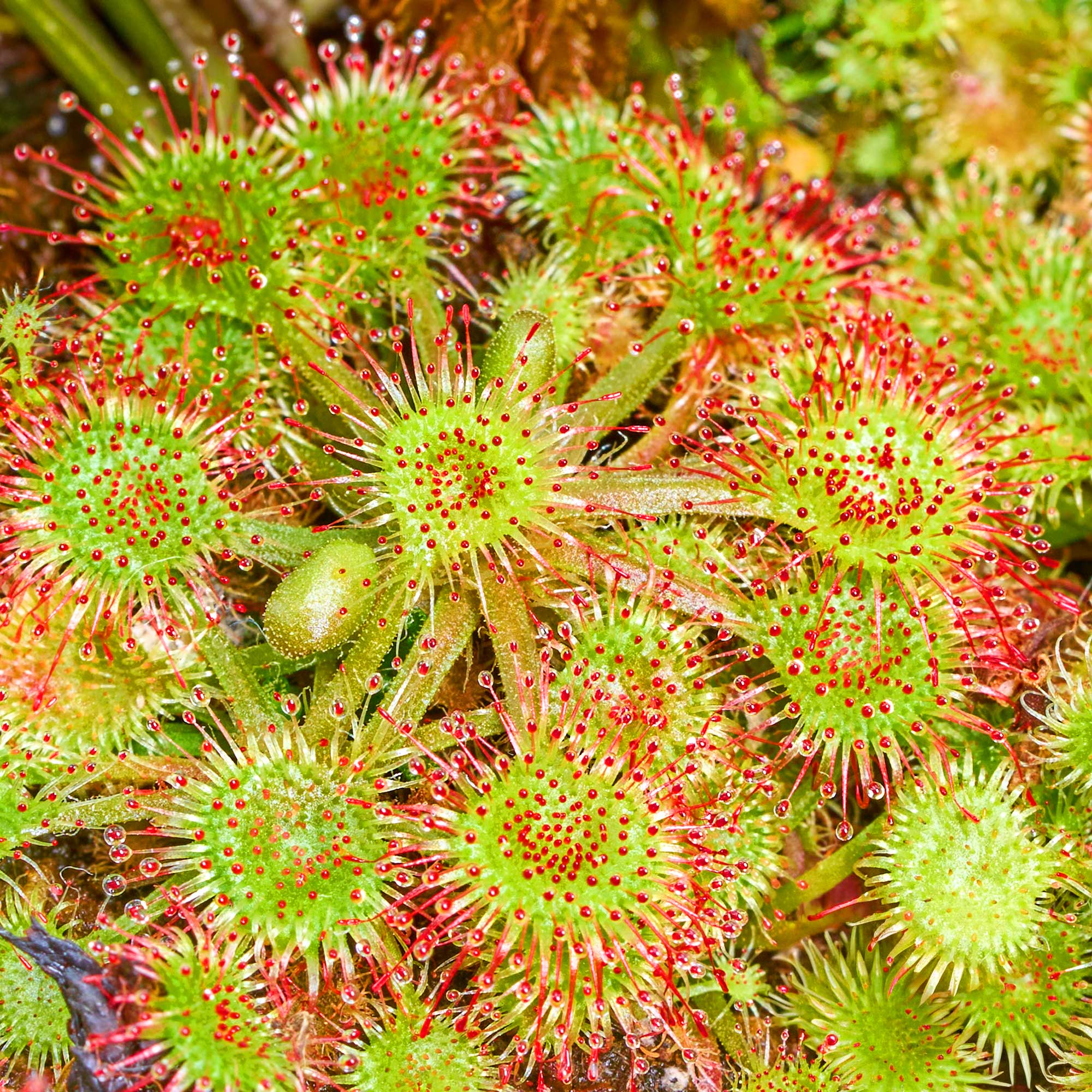Der Rundblättrige Sonnentau ist eine kleine Karnivore, die kriechend wächst und unter starkem Licht beeindruckend rote Fangorgane ausbildet.